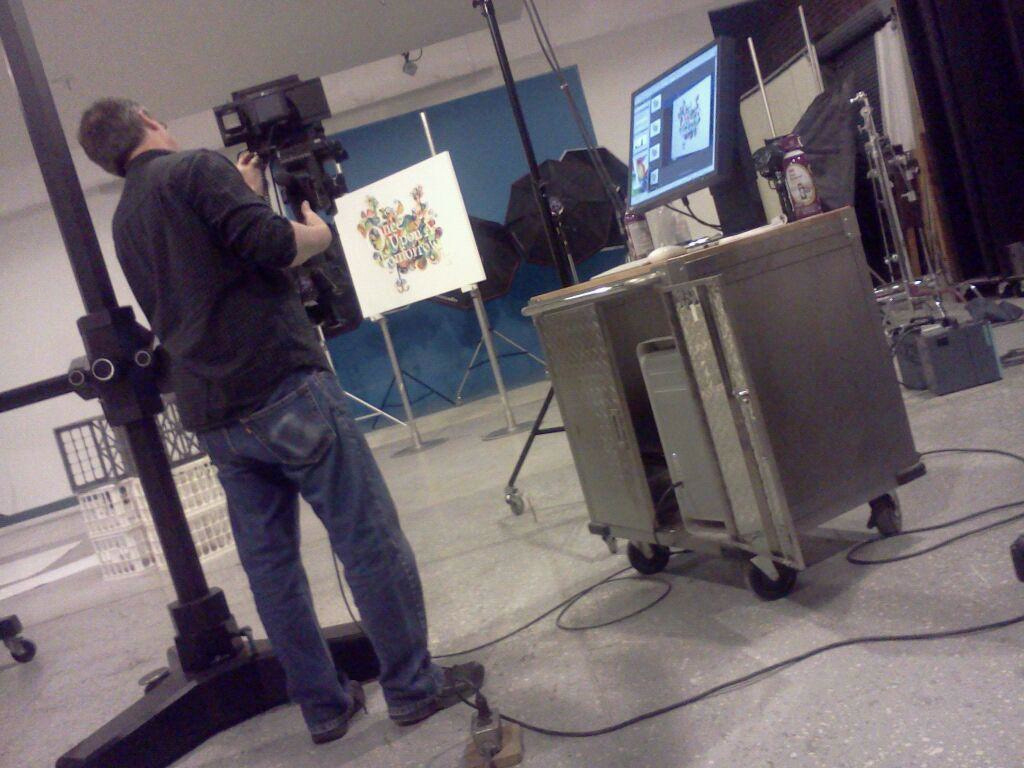 Here are some iPhone photos of the main graphic being built and photographed. Sorry for the poor quality shots.